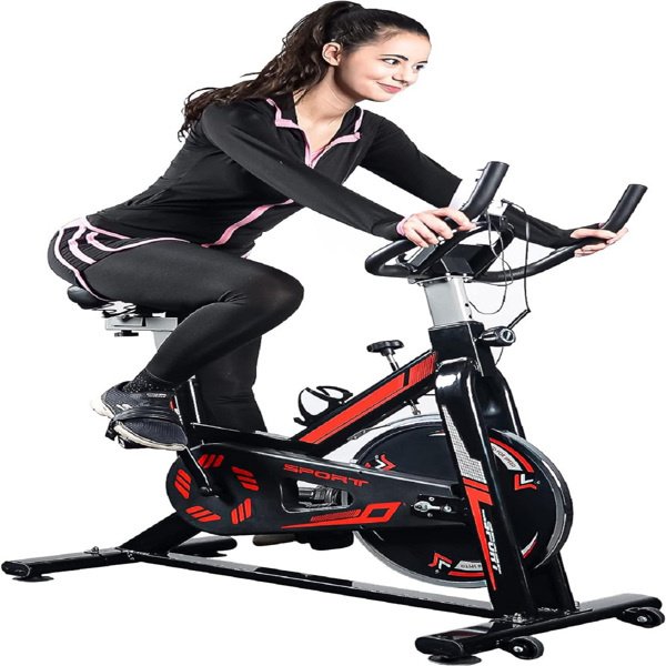 indoor cycling bike equipped with the belt drive system and heavy flywheel, adjustable seat and adjustable handlebar to accommodate users of different heights and weights. Transportation wheels make it easy to move.