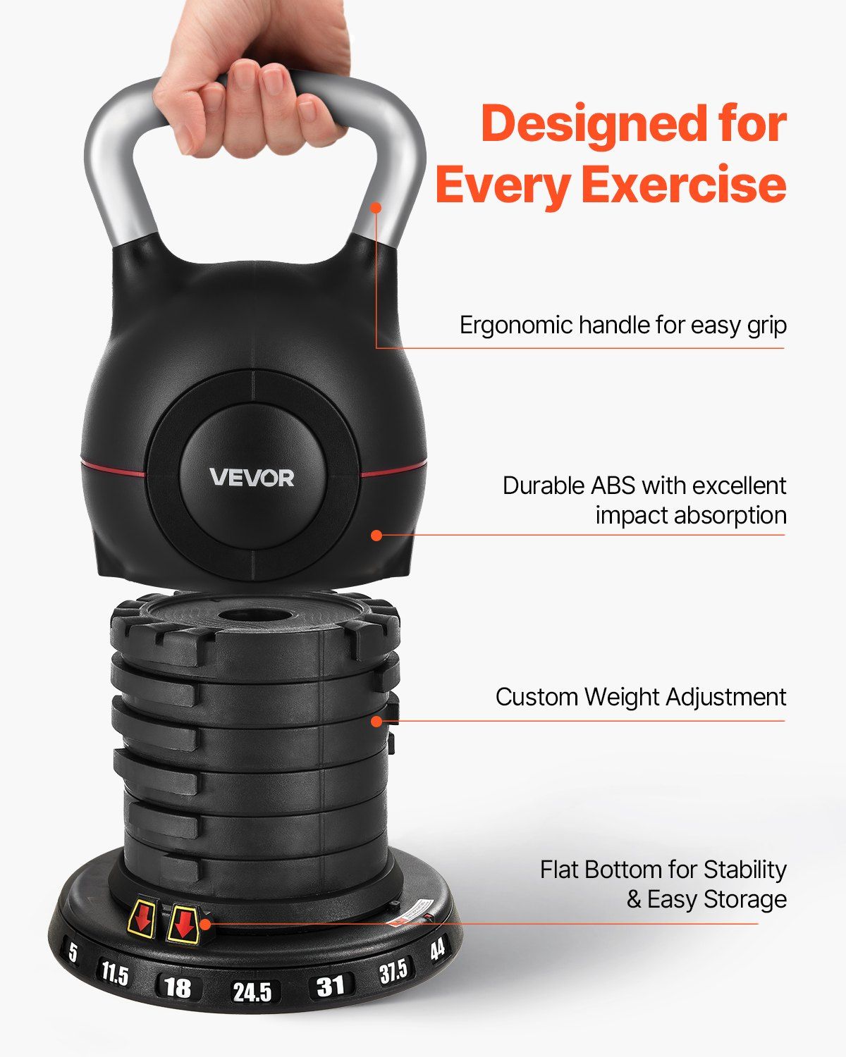 Home > VEVOR Kettlebell, Adjustable Kettlebell with 7 Weight Levels (5, 11.5, 18, 24.5, 31, 37.5, 44 lbs), Die-Cast Aluminum and ABS Material, for Grip Stren