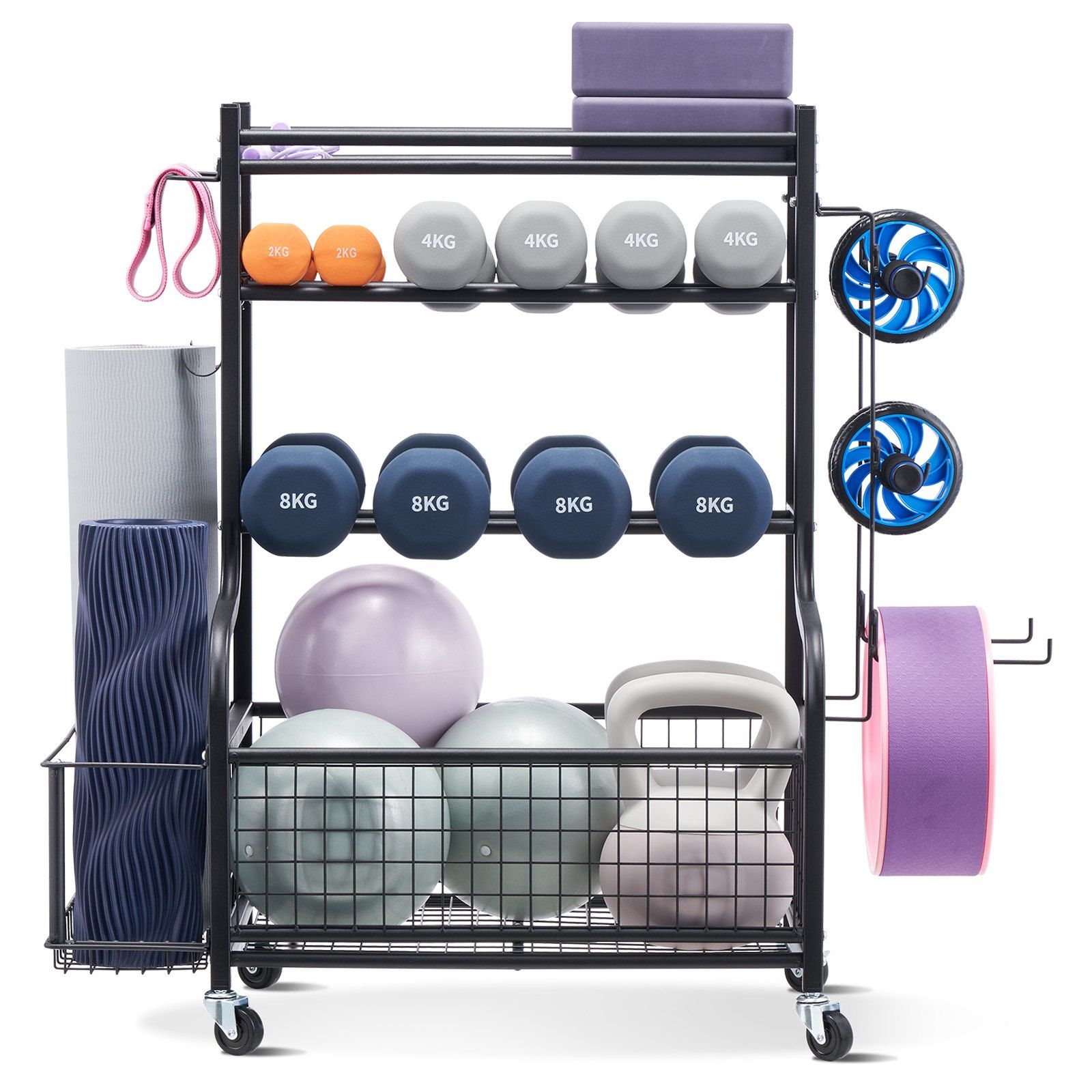 With various storage spaces and methods, this yoga mat holder maximizes the storage capacity of your workout equipment, making it easier to access items at the bottom. Equipped with four sturdy 360-degree wheels (two lockable), it meets your needs for mobility and stability.