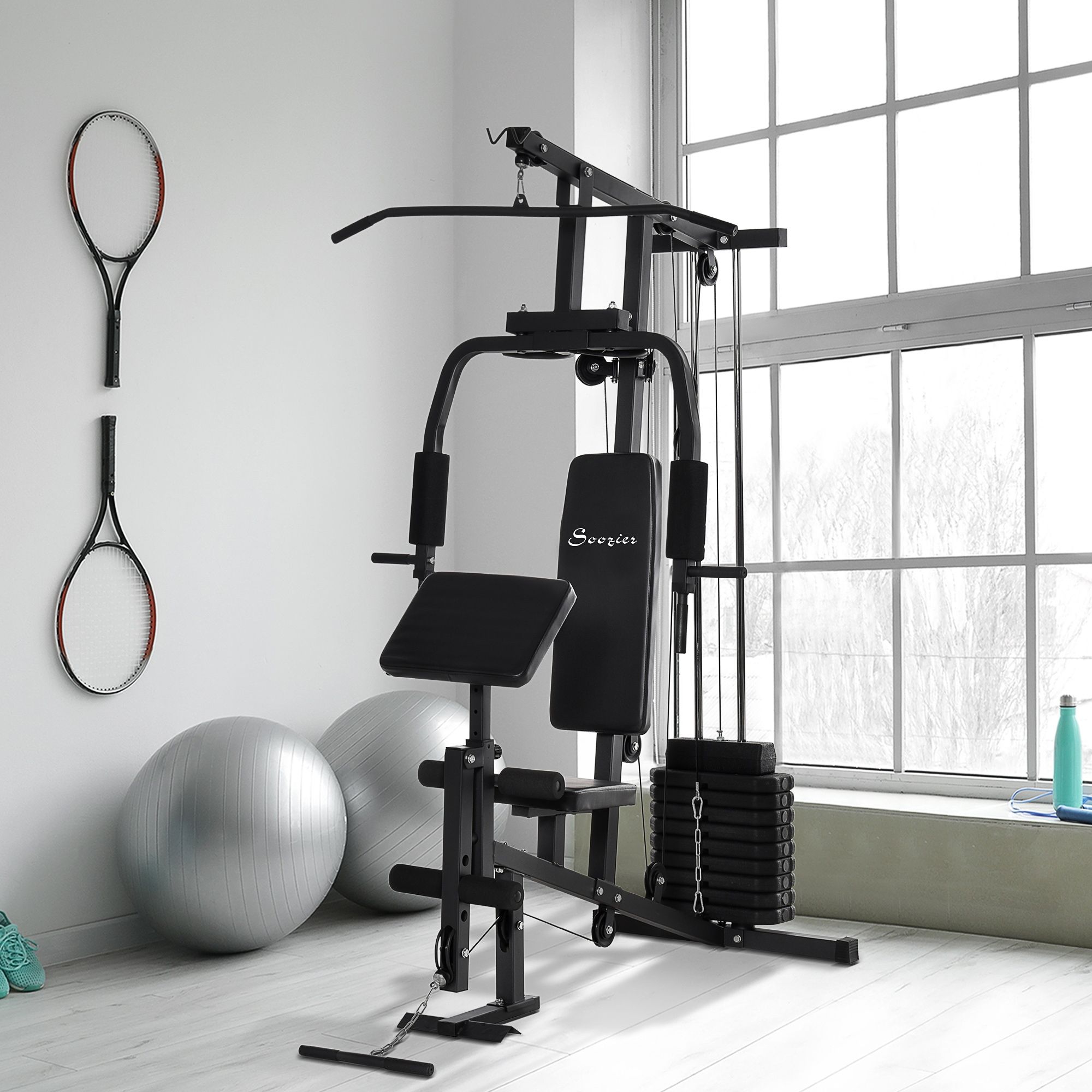 This home multi-exercise strength training equipment from Soozier allows you to take control of your home workout routine. You can use it to train your arms, legs, waist, and ab muscles for a full body workout. Adjust the weight amount and angle of the leg developer to keep your workouts challenging and effective.